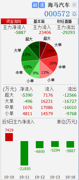 由于海馬汽車第三季度業(yè)績(jī)預(yù)計(jì)面臨虧損,在新能源概念炒作結(jié)束之后,資金早在10月11日便開始瘋狂出逃。10月11日當(dāng)天交易日,主力資金出逃2.19億元,并在隨后的三個(gè)交易日繼續(xù)大單流出。這也導(dǎo)致海馬汽車的股價(jià)在近幾個(gè)交易日出現(xiàn)大幅下滑。10月16日當(dāng)天交易日上,海馬汽車股價(jià)跌幅近8%,令人咂舌。