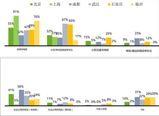 調查發現,新能源汽車用戶70%為男性,一半用戶年齡在30歲到39歲之間,74%的用戶為已有或將有孩家庭。北京、武漢、石家莊的消費者購置車型以國產純電動中端車為主,上海、成都的消費者購置車型以插電混合動力為主,臨沂消費者以購買國產低端電動車為主。新能源車主的出行目的呈現多元化特征,對于不同城市的車主,新能源汽車已經基本能夠滿足用戶的日常出行需求。大多數新能源汽車車主都能夠積極充電,自有樁建設情況好的城市主要依賴自有樁和單位樁充電,自有樁建設情況不佳的城市,飛線充電(從家里引出長長的電源插線板給車充電)比例較高,超過半數的用戶表示如果不能建設自有樁,將不會選擇購買新能源汽車。