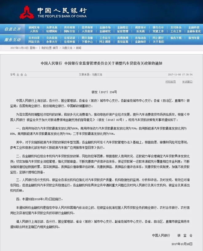 央行和銀監會近日聯合發布《關于調整汽車貸款有關政策的通知》,宣布自2018年1月1日起,自用傳統動力汽車貸款最高發放比例為80%(未調整),商用傳統動力汽車貸款最高發放比例為70%(未調整);自用新能源汽車貸款最高發放比例為85%(新增),商用新能源汽車貸款最高發放比例為75%(新增);二手車貸款最高發放比例為70%(調整)。