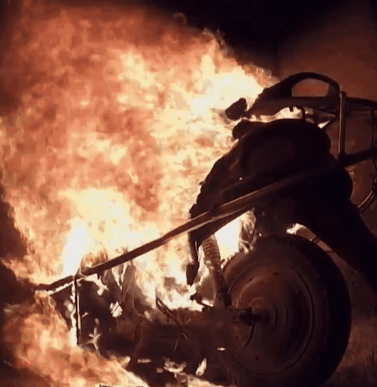 不到10分鐘時間,電動車尾部開始冒出黑煙,冒煙40秒后火勢迅速擴大,1分鐘內黑煙越來越多,并伴有火焰滴落。